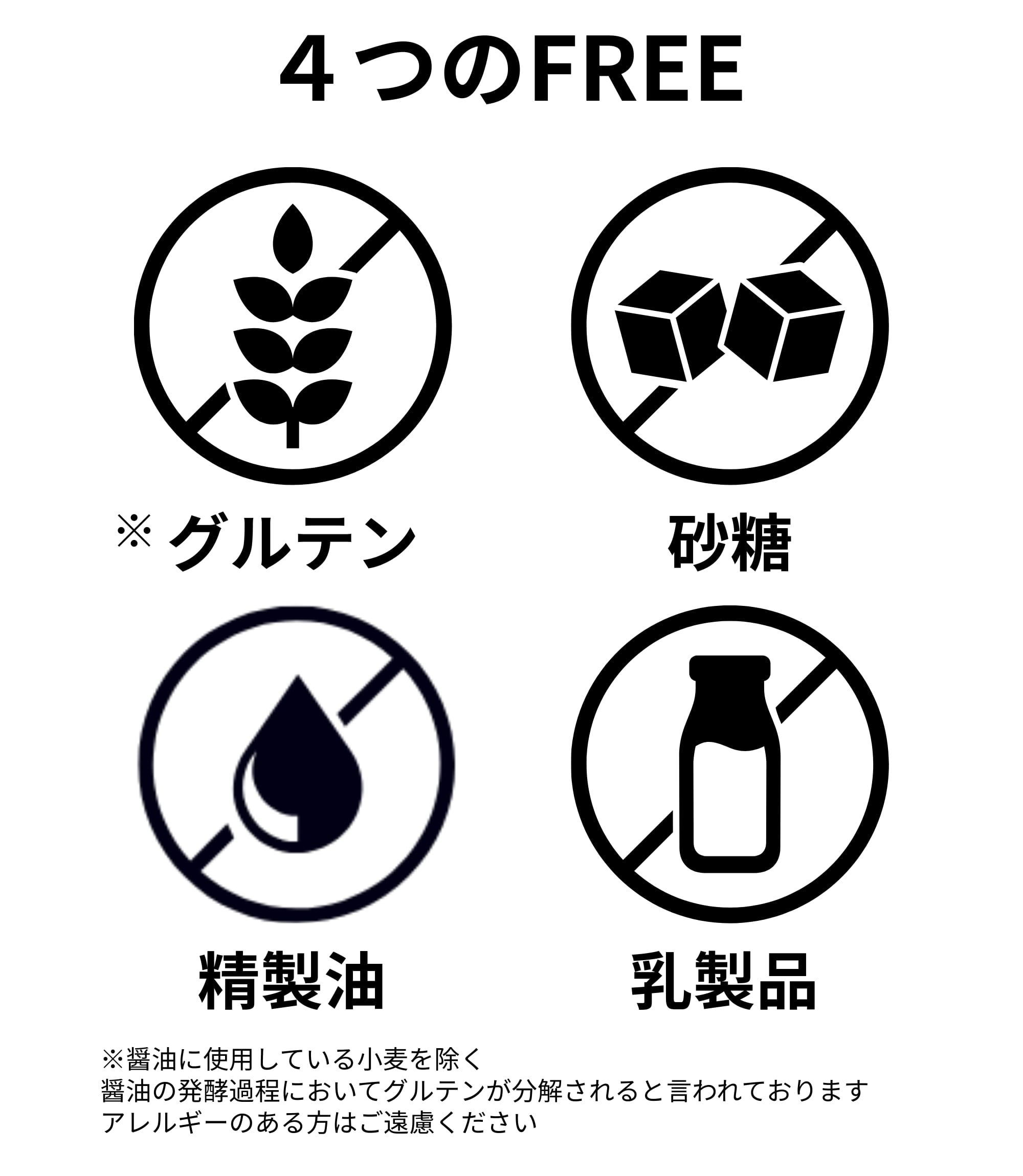 小麦(醤油に使用している小麦を除く、アレルギーのある方はご遠慮ください)、乳製品、精製した油、食品添加物(化学調味料、着色料、保存料、香料など)を使用していません