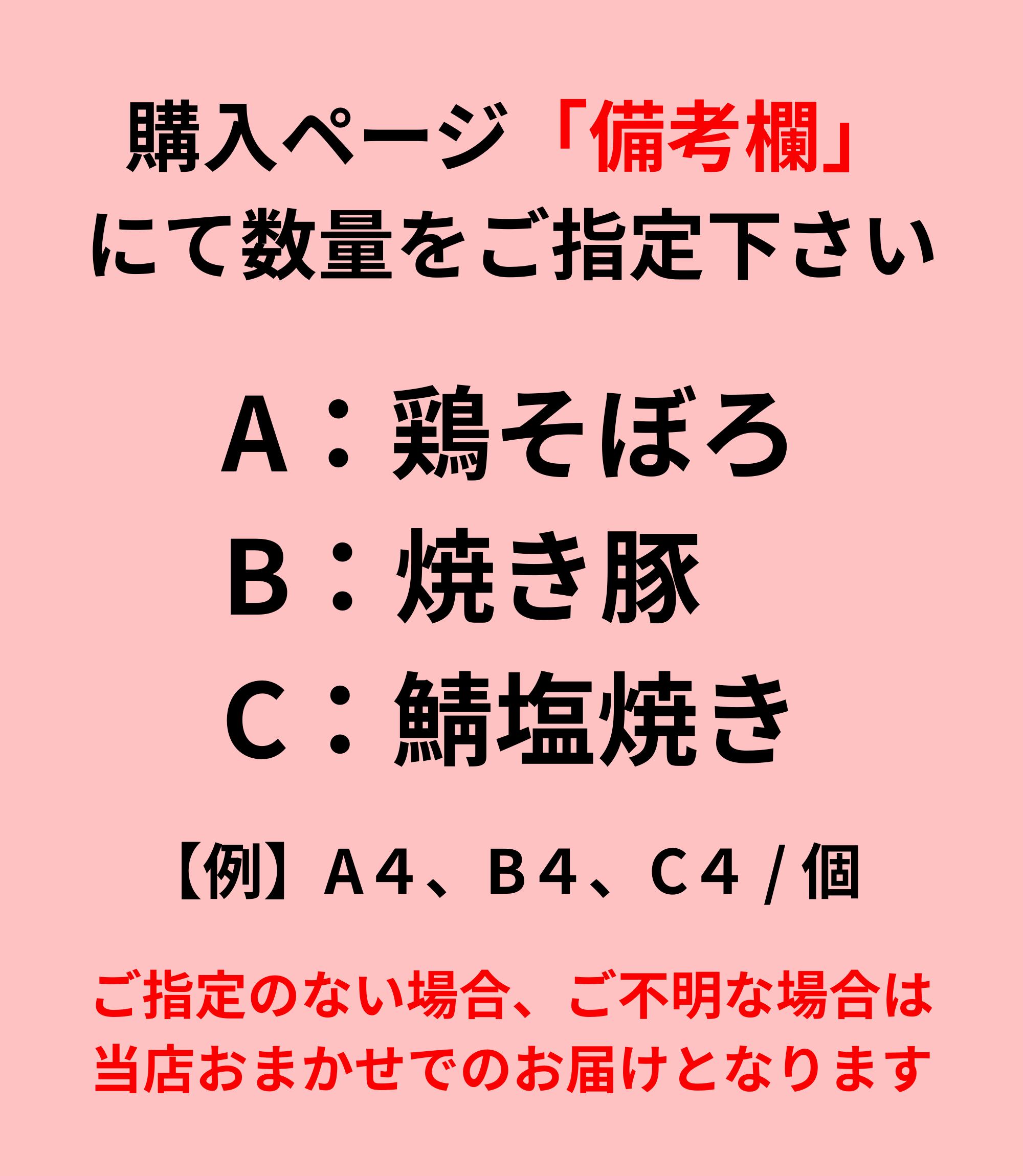 A鶏そぼろ、B焼き豚、C鯖塩焼き